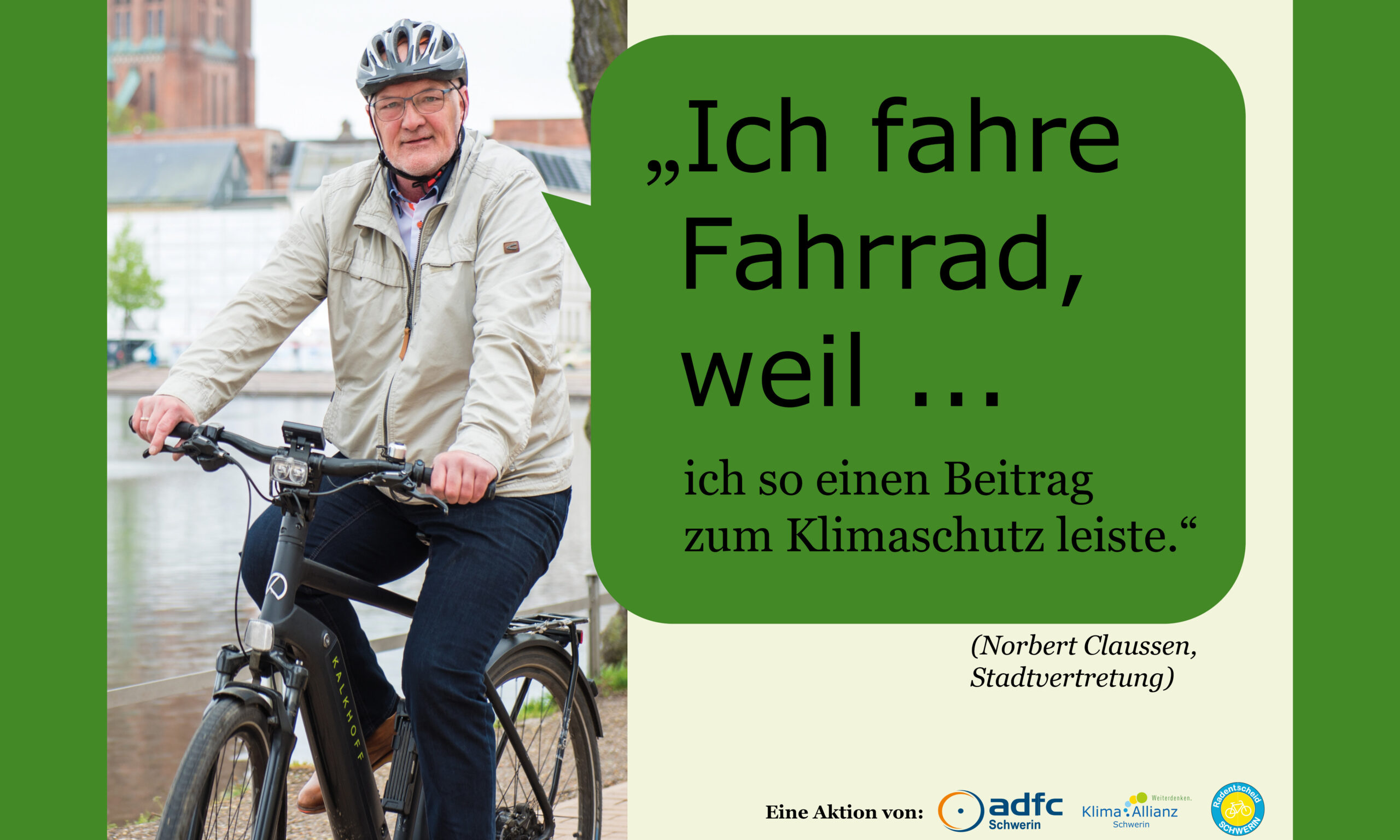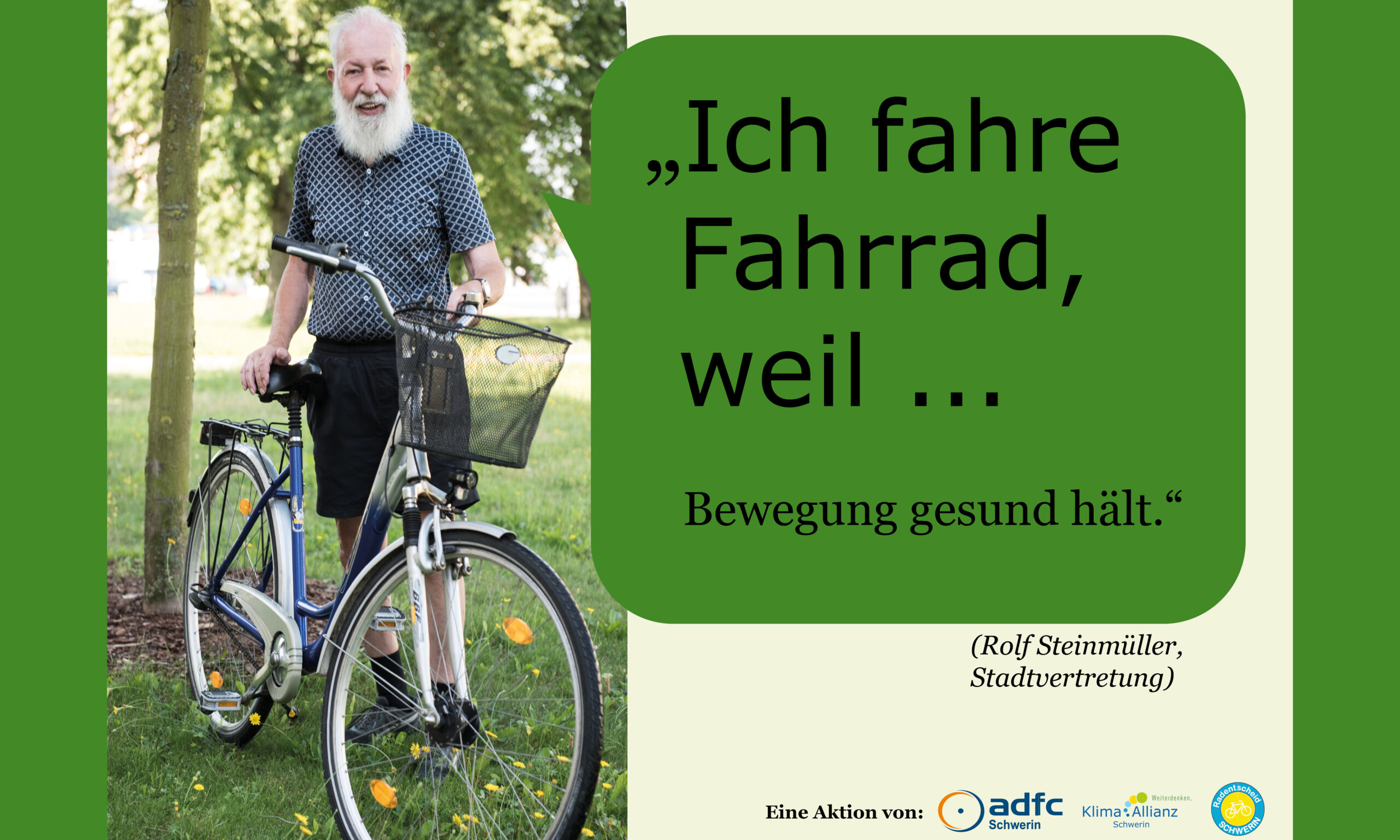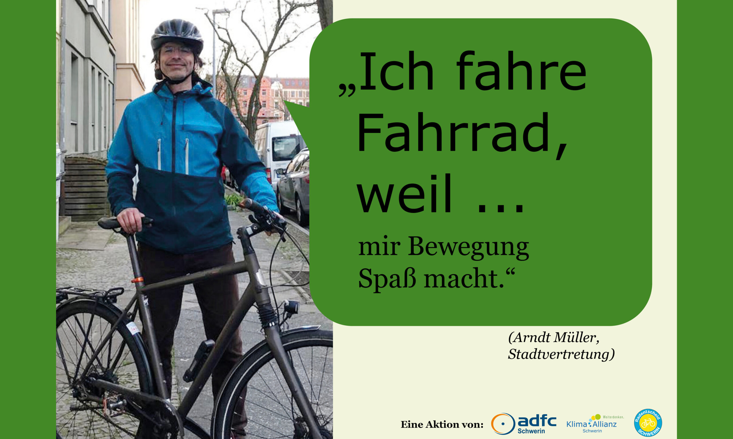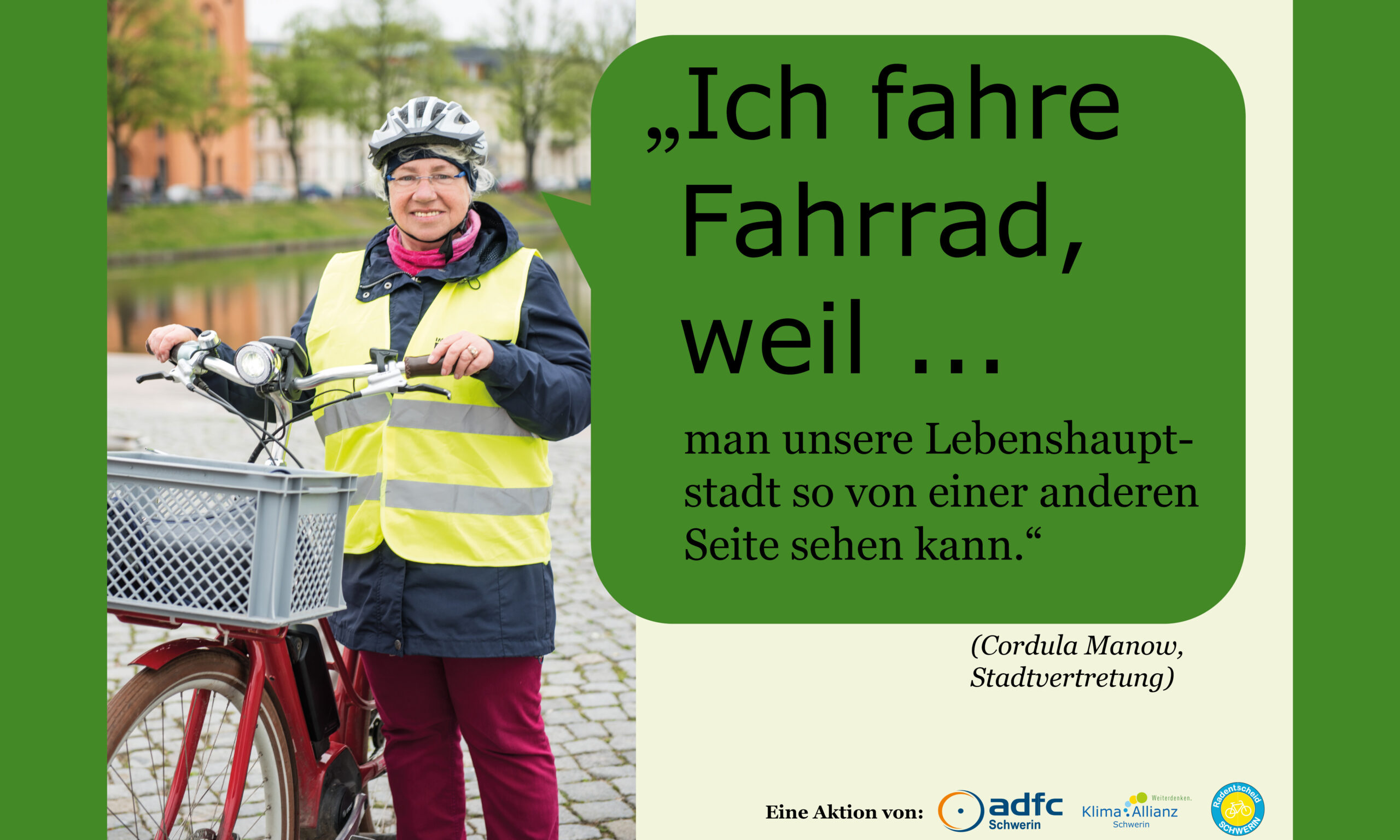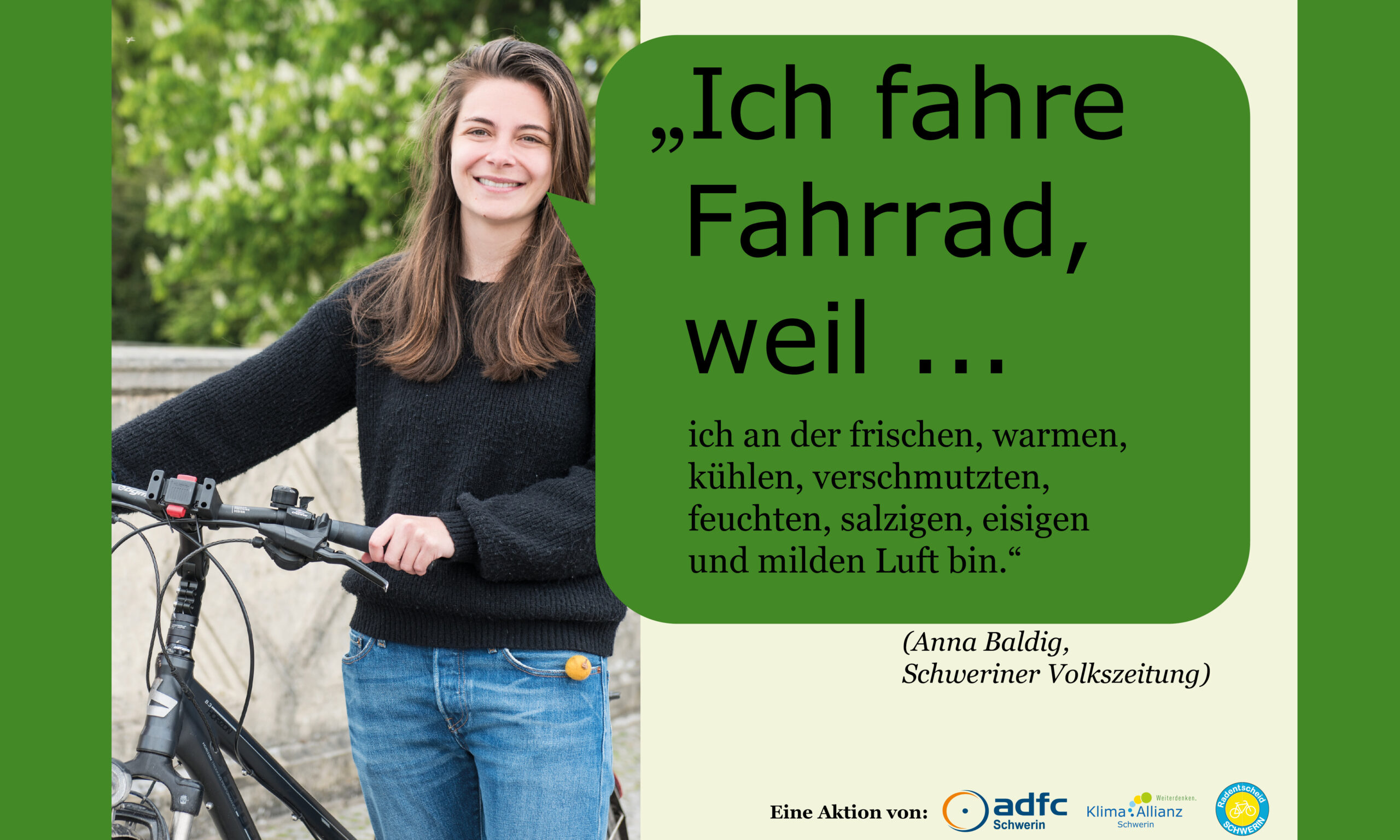 Gemeinsam mit dem ADFC Schwerin und dem Radentscheid Schwerin hat die Klima Allianz Schwerin die Kampagene „Ich fahre Fahrrad, weil…“ ins Leben gerufen. Hier werden Schweriner Persönlichkeiten gezeigt, die häufig mit dem Fahrrad unterwegs sind. Ihre Gründe, die für das Fahrrad sprechen, sehen ihr hier:
