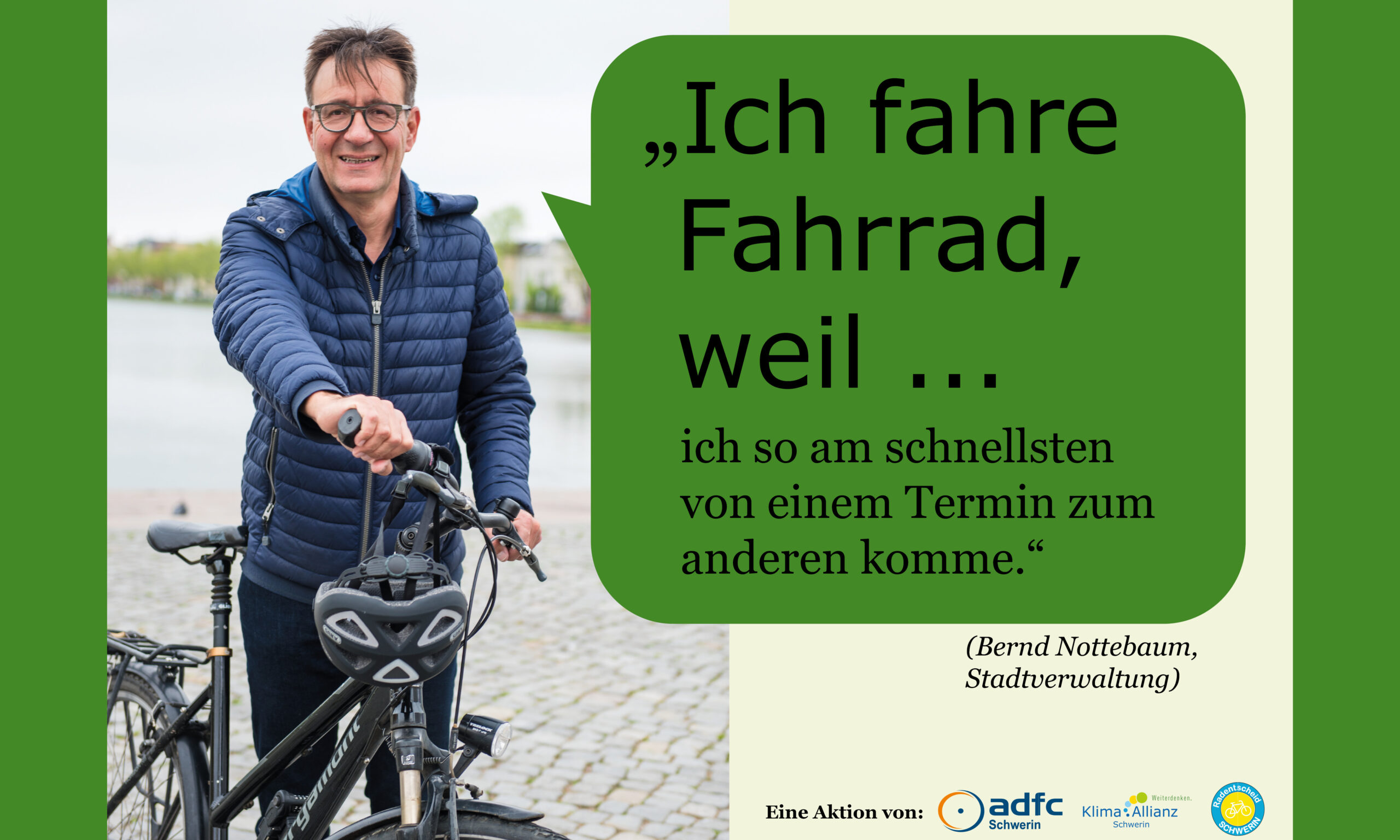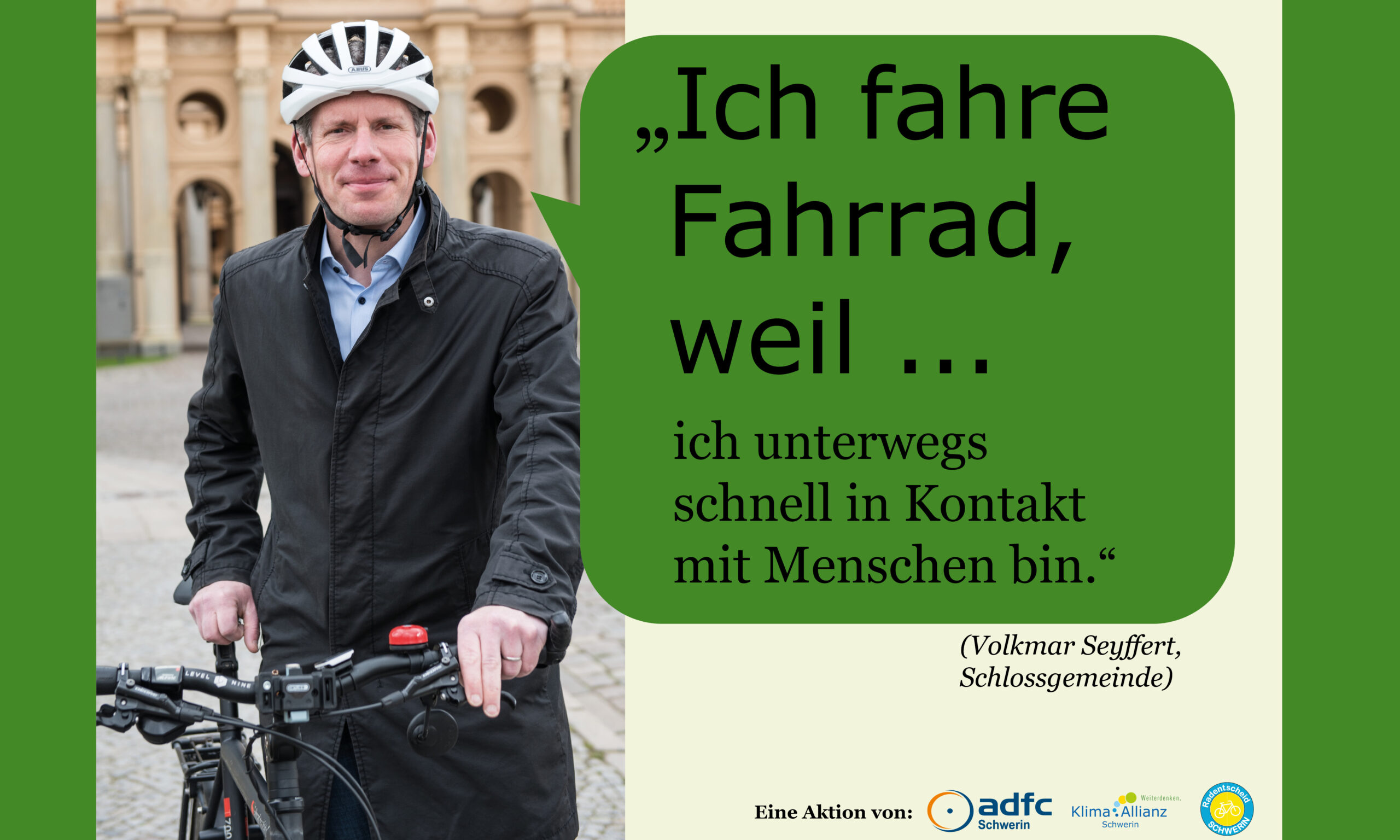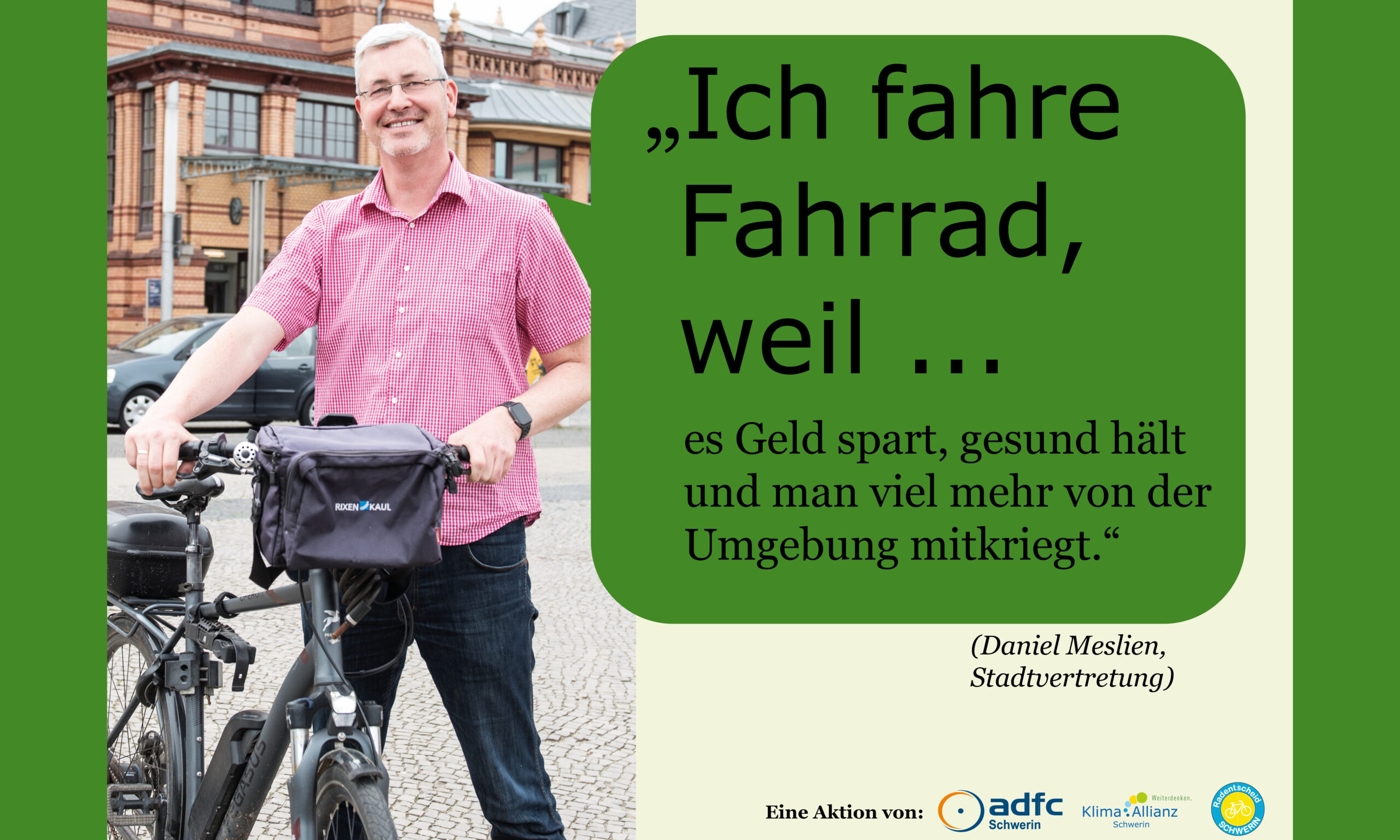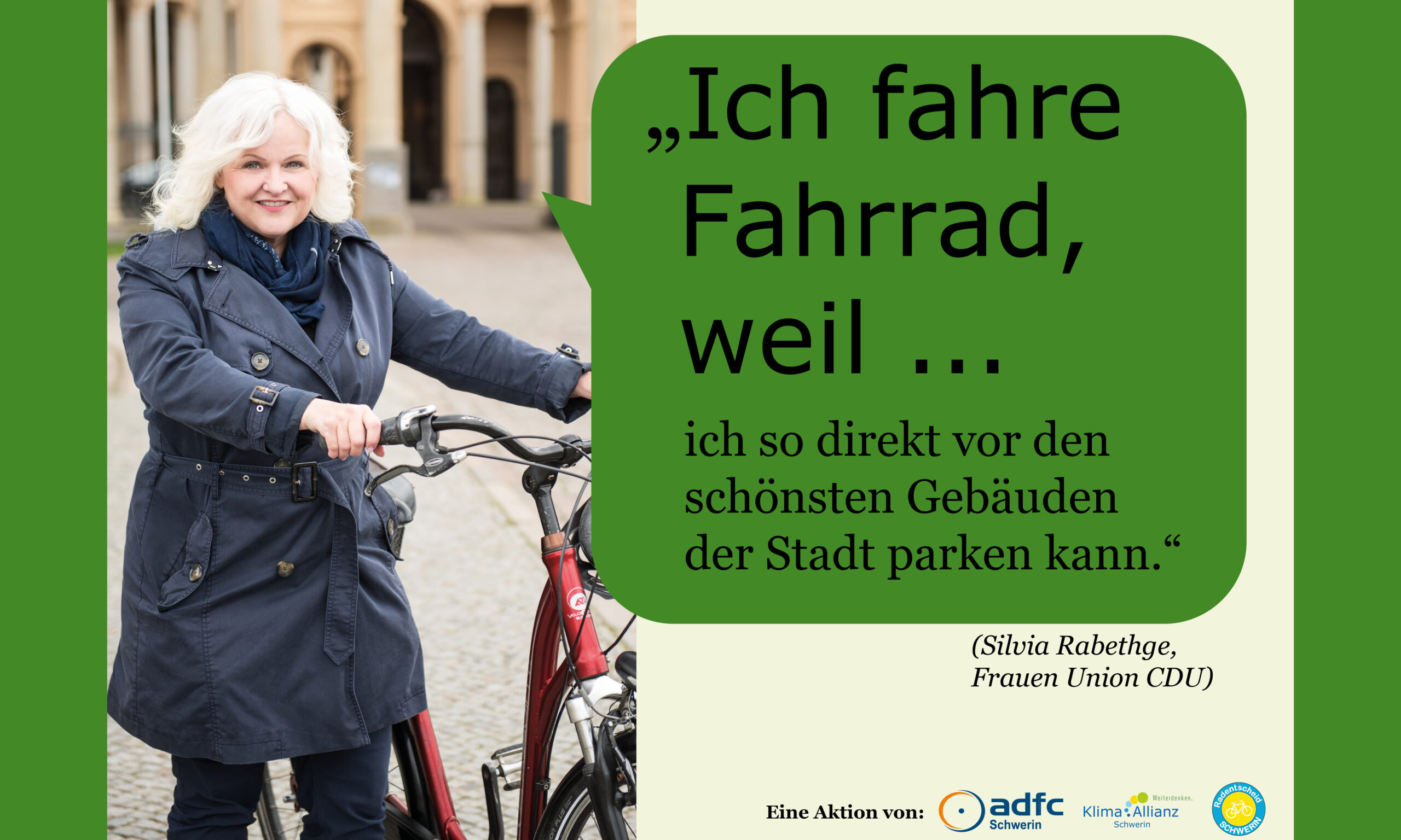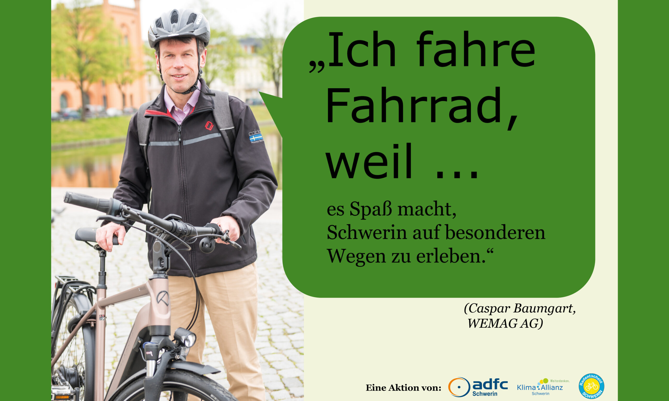 Gemeinsam mit dem ADFC Schwerin und dem Radentscheid Schwerin hat die Klima Allianz Schwerin die Kampagene „Ich fahre Fahrrad, weil…“ ins Leben gerufen. Hier werden Schweriner Persönlichkeiten gezeigt, die häufig mit dem Fahrrad unterwegs sind. Ihre Gründe, die für das Fahrrad sprechen, sehen ihr hier: